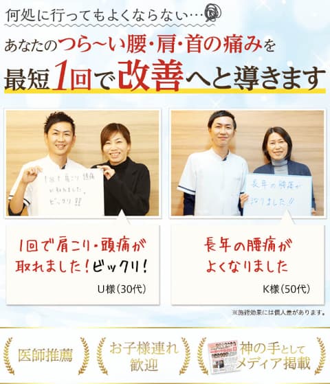それは、痛みのある部分だけしか施術をしない先生にあたってしまったからです。実は全身をみて、痛みを引き起こす本当の原因を改善が必要です。当院なら、痛みや悩みをだけでなくステキなみらいを手に入れる事ができすよ。